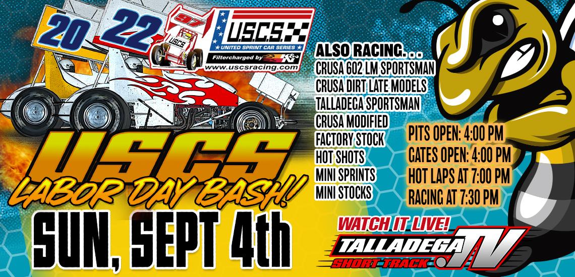 Labor Day Weekend!... on SUNDAY, SEPTEMBER 4TH the USCS Outlaw Thunder Tour presented by K&N Filters winged sprint cars invade historic Talladega Short Track for the annual USCS Salute to American Labor Sprint Car Shootout Round #3-weekend finale at 7:30 pm!